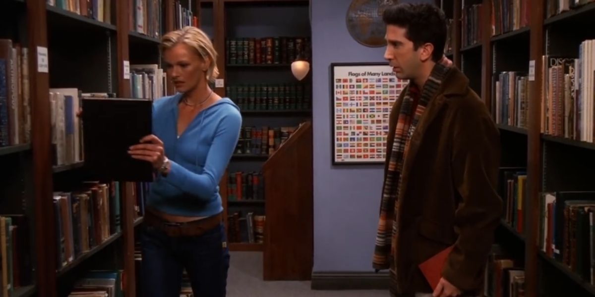 Sintiéndose insultado, Ross decide hacer guardia afuera de la sección de Paleontología, impidiendo que cualquier pareja se relacione allí. Sin embargo, sus planes rápidamente se van por la ventana cuando una hermosa mujer entra en la sección y revela que ha leído su disertación. No pasa mucho tiempo hasta que Ross y la chica se ponen juguetones entre los estantes de la biblioteca, lo que los lleva a ser atrapados por la seguridad del campus en Uno de los momentos divertidos más subestimados del programa.
