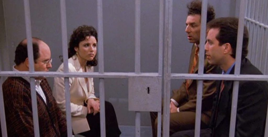 Jerry, George, Elaine y Kramer actúan horriblemente fuera de lugar en el final de la serie cuando ven a un hombre siendo robado y solo miran y ríen. Lleva a posiblemente la trama más oscura de Seinfeld historia, que es parte de por qué era tan impopular entre los fanáticos del programa, porque no se ajusta al tono del resto de la serie. Los llevan a juicio por violar la ley de "Buen Samaritano" de Latham, Massachusetts, y en los momentos finales del episodio, el jurado los declara culpables y los envían a prisión. La escena final del programa encuentra a los personajes caminando silenciosamente en una cárcel para ser encerrados.