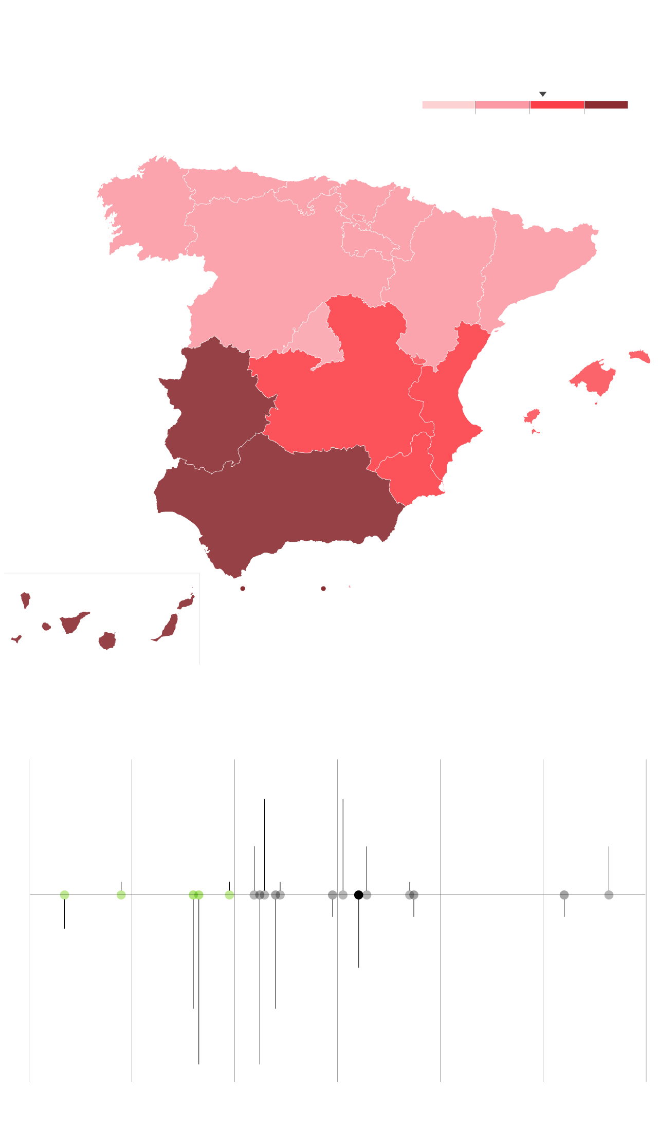 Tasa de paro de las comunidades. El mercado laboral español sigue teniendo una nítida división en dos. La comunidades del sur suelen tener una tasa de paro bastante más alta que las del norte y, además, es habitual que las crisis les afecten más. De nuevo ha vuelto a verse en esta ocasión. En varias (Andalucía, Extremadura, Canarias, Ceuta y Melilla) ha vuelto a superarse el 20% de desempleo. En cambio, el País Vasco, Cantabria o Navarra han resistido mejor el embate.