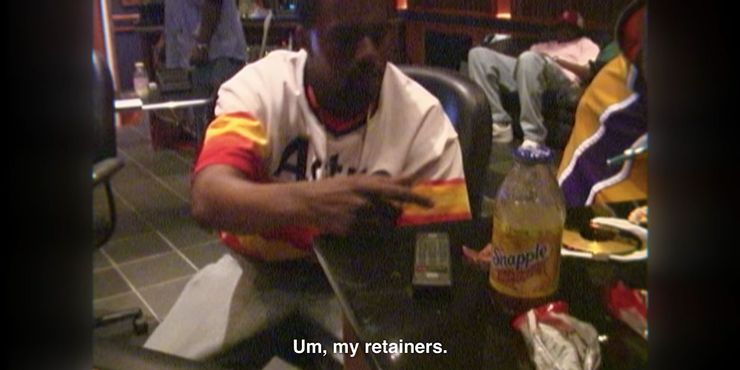Saca el retenedor y lo pone sobre una mesa frente al rapero Scarface, durante una escena. Scarface le dice asquerosamente a Kanye que el retenedor que ha estado en su boca no pertenece a ningún lugar al azar.