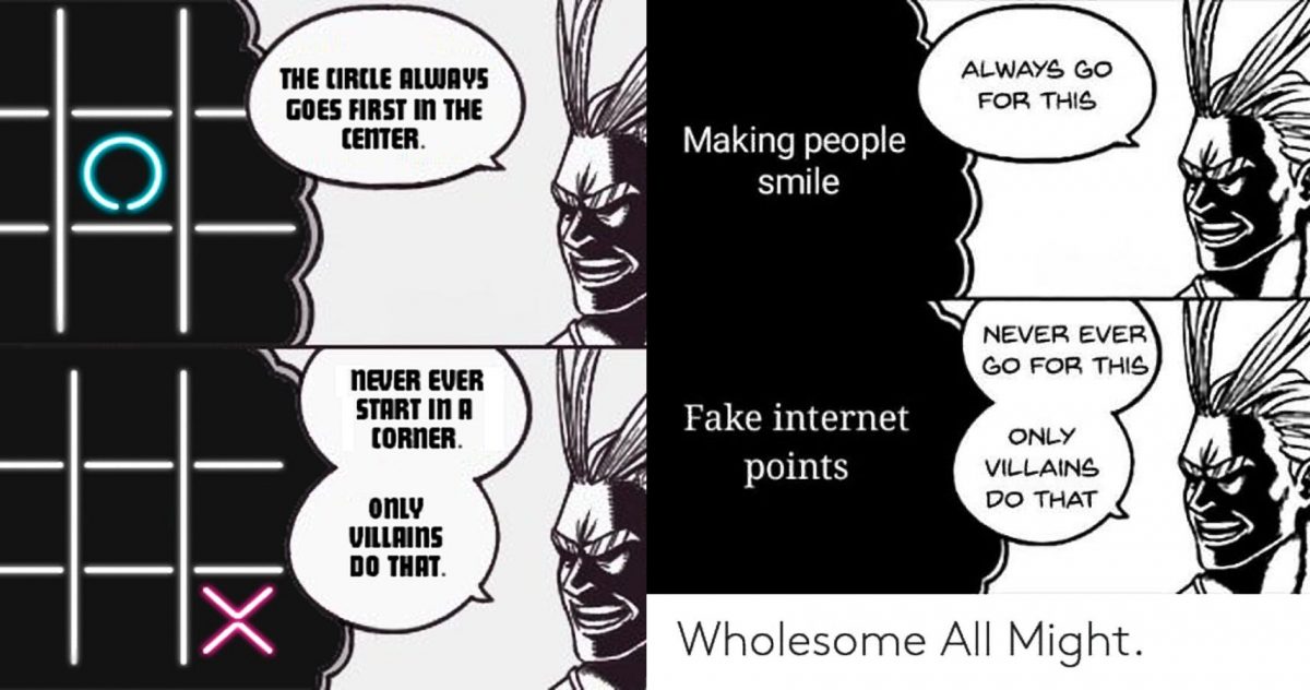 En 2017, un meme nació cuando el personaje conocido como "All Might" de Mi hero academia fue explotado para convertirlo en una imagen en la que calificó algo deseable como la opción "siempre", mientras que la opción menos que deseable se consideró como algo que "solo hacen los villanos". El meme tomó fuerza a finales del año pasado y sorprendentemente ha visto un aumento repentino. en 2019.