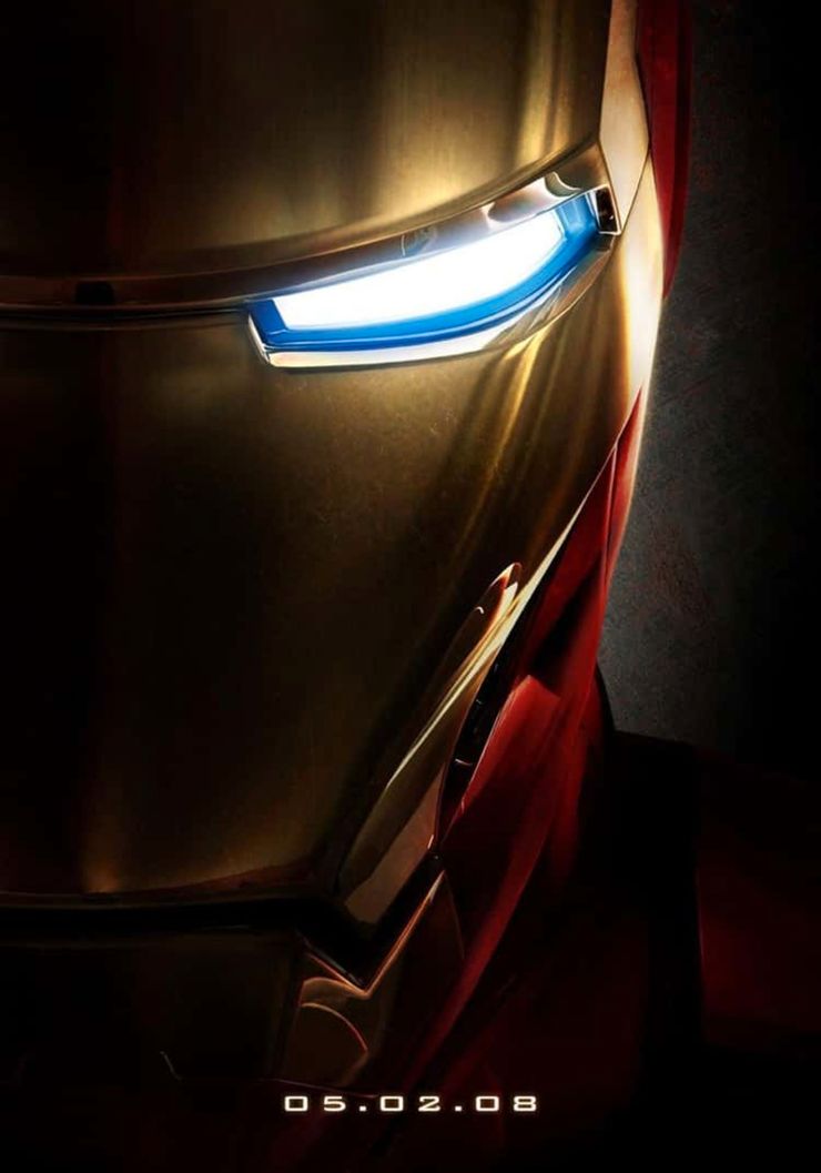 El póster de la primera película de Marvel Studios simplemente muestra la mitad de la cara de Iron Man y lo deja así. También se indica la fecha exacta de lanzamiento: