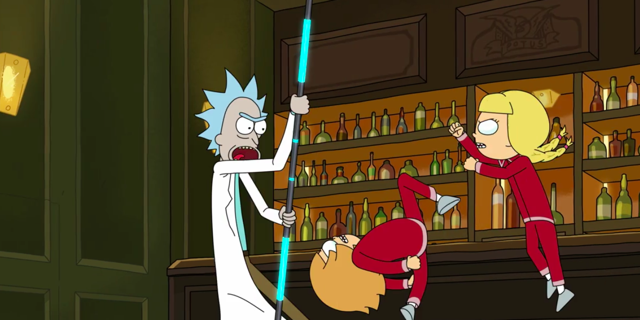 En "The Rickchurian Mortydate", cuando Rick y el presidente Obama chocan entre sí por el ex presidente que se niega a tomarse una selfie con Morty, la pelea es una secuencia de acción cinematográfica en expansión de pura diversión de ciencia ficción. En un momento, Rick usa un báculo que brilla en ambos extremos, que recuerda al sable de luz de Darth Maul, incluso enfrentando a dos oponentes a la vez.