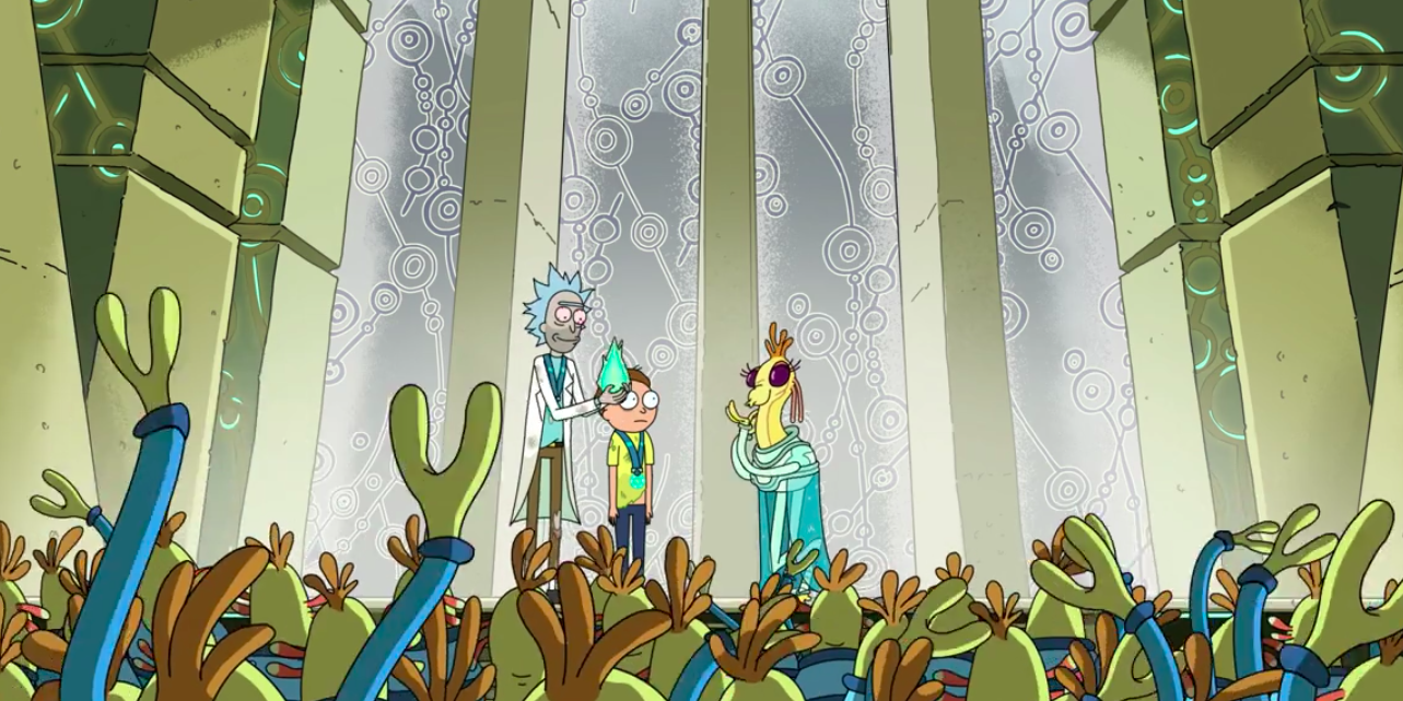 Esta es la última parte del largo pastiche de las referencias de Star Wars al comienzo de "Rest and Ricklaxation". Si bien las secuencias anteriores evocaron los eventos de la Batalla de Yavin a través de la destrucción de la Estrella de la Muerte, esto es seguido por un homenaje a la ceremonia de premiación donde Han y Luke recibieron medallas por su valor para ayudar a la Alianza Rebelde, solo en el Rick y Morty versión, la princesa es un extraterrestre inhumano.