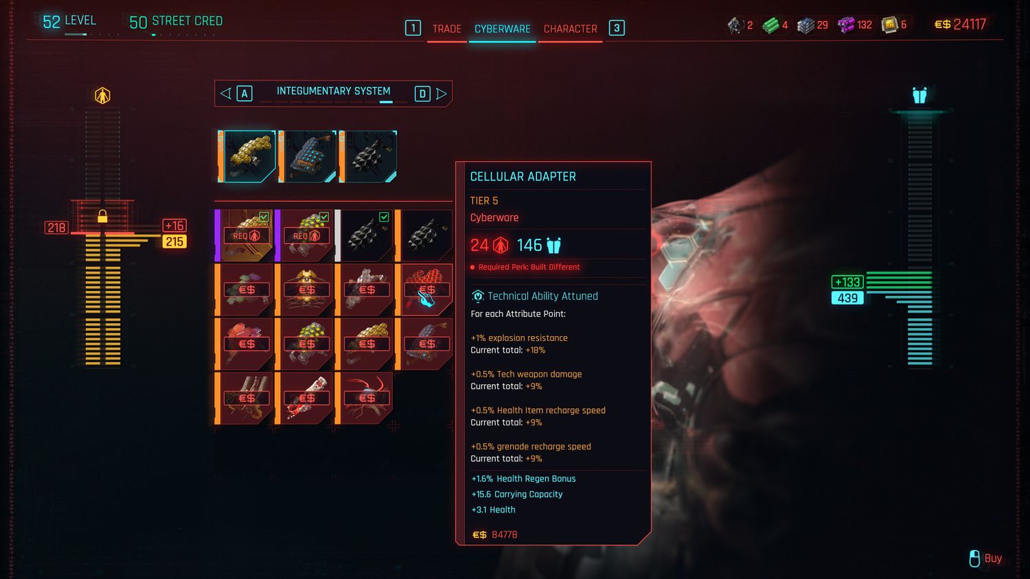 El Adaptador celular es uno de los implantes más exclusivos que V puede instalar, ya que en realidad requiere el Beneficio diferente construido trabajar. Build Different estará disponible una vez que V tenga un atributo de habilidad técnica de 15 y sea una excelente opción para construcciones basadas en tecnología. Después de la actualización, V ya no obtiene protección de la ropa y, en su lugar, obtiene armadura del ciberware Skeleton y del sistema tegumentario. Como tal, V necesita implantes en estas ranuras para protegerse.