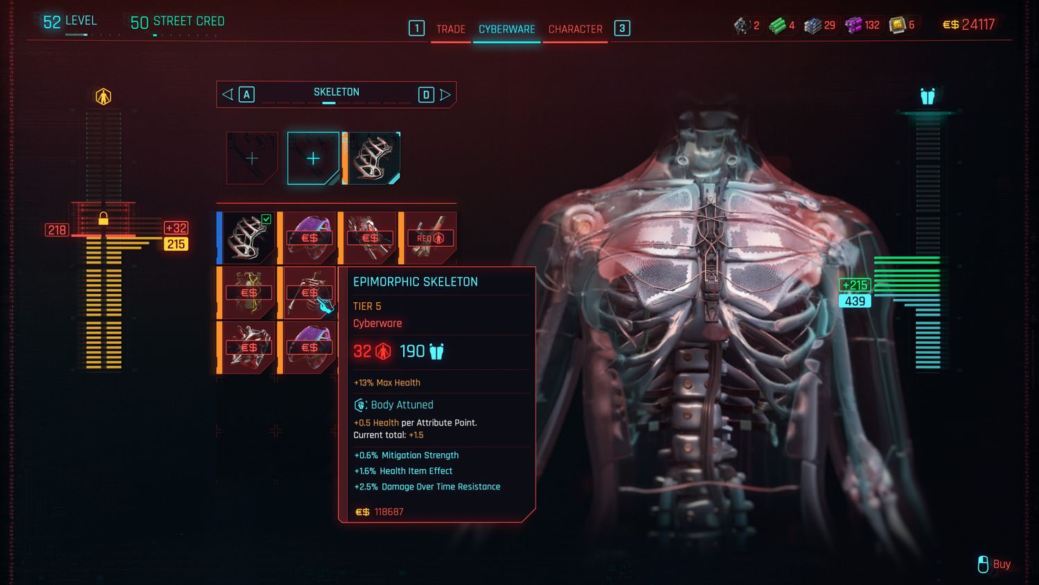 Al igual que el adaptador celular, el Esqueleto epimórfico El ciberware ofrece protección adicional. Sin embargo, a diferencia del Adaptador Celular, el Esqueleto Epimórfico es extremadamente básico. V recibe salud adicional y una gran cantidad de armadura adicional (una impresionante armadura 190 en el nivel 5). Es una opción sólida para todas las configuraciones, pero los jugadores se concentraron en acercarse y usar una configuración Blunt Bruiser para beneficiarse al máximo.
