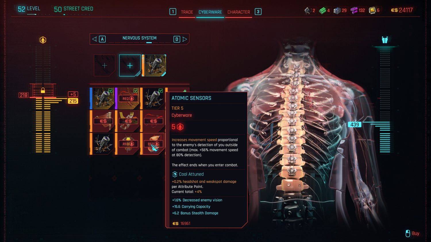 El Sensores atómicos Ciberware aumenta la velocidad de movimiento de V en relación con la detección de enemigos cercanos. Esencialmente, cuanto más cerca esté V de ser detectado por un enemigo, más rápido se moverá. Está limitado a un aumento del 56% en la velocidad de movimiento con una detección del enemigo del 80%, pero sigue siendo una de las mejores opciones para configuraciones basadas en sigilo. Ciberpunk 2077. El implante le permite a V usar la detección de enemigos para moverse aún más rápido, ejecutando derribos sigilosos antes de que los enemigos puedan responder.