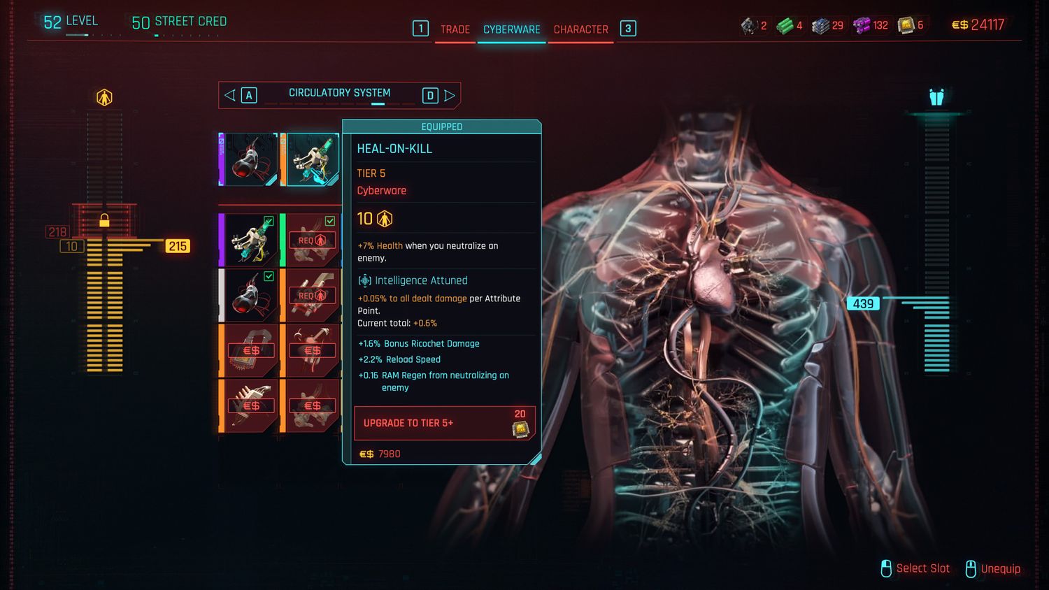 Vale la pena señalar que el Sistema Circulatorio tiene varias ranuras abiertas para Cyberware adicional, por lo que los jugadores aún pueden instalar otro Cyberware que se ajuste a su versión. También está sintonizado con la Inteligencia de V y aumenta ligeramente el daño. A diferencia de algunos Cyberware, que solo se adaptan a ciertas versiones específicas, Heal-On-Kill es un bono general para todo uso que vale la pena tener en todas tus partidas.