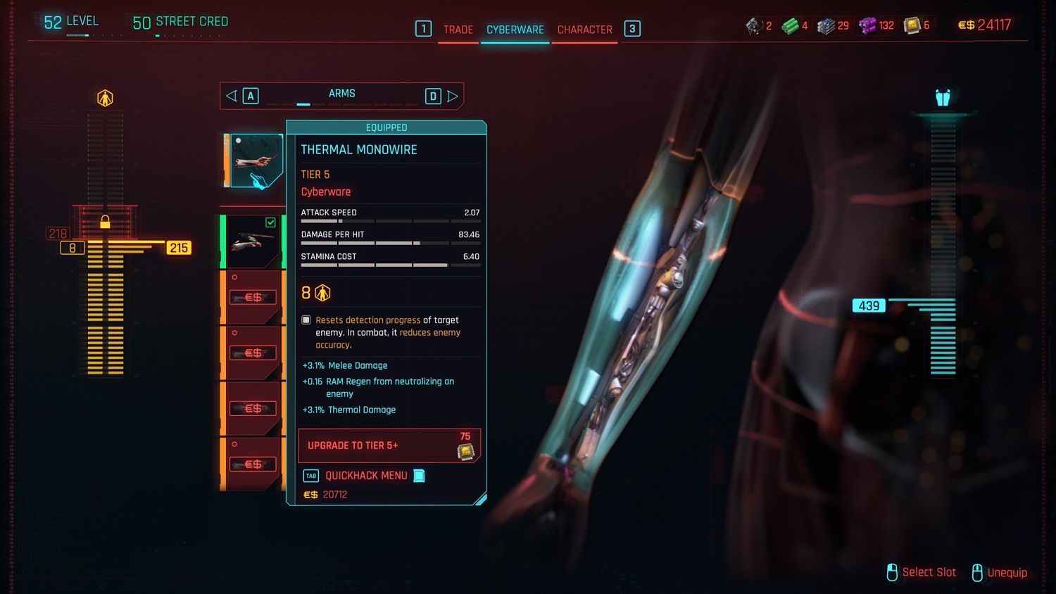 V puede instalar Cyberware en diez partes diferentes del cuerpo: piernas, sistema tegumentario, sistema circulatorio, sistema nervioso, manos, esqueleto, cara, brazos, sistema operativo y corteza frontal. Los implantes pueden tener varias funciones que van desde armadura pasiva y mejoras de combate hasta permitir saltos dobles. También vale la pena señalar que, aunque V es prácticamente inmune a la ciberpsicosis, la nueva mecánica de Capacidad de Cyberware limita la cantidad que pueden instalar a la vez.