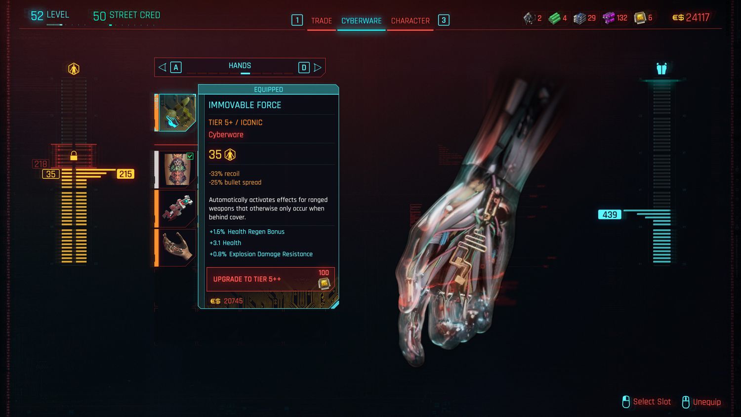 Para construcciones que usan armas a distancia, Fuerza inamovible Es quizás la mejor opción para Hands Cyberware. Reduce drásticamente el retroceso y la propagación de la bala, mejorando la precisión de V cuando usa armas a distancia. Antes de la Actualización 2.0, V estaba limitado a una sola ranura para Hands Cyberware, que ahora se puede aumentar a dos con el Beneficio ambidiestro. Los jugadores que quieran combinar el aumento de precisión de Immovable Force con implantes adicionales pueden hacerlo.
