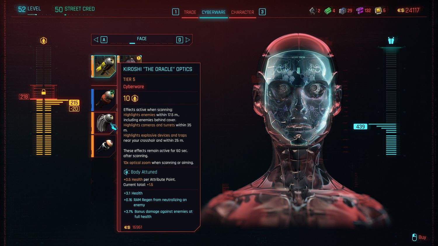 El Óptica Kiroshi “El Oráculo” son posiblemente la mejor opción para la óptica, ya que mejoran significativamente el escáner de V.