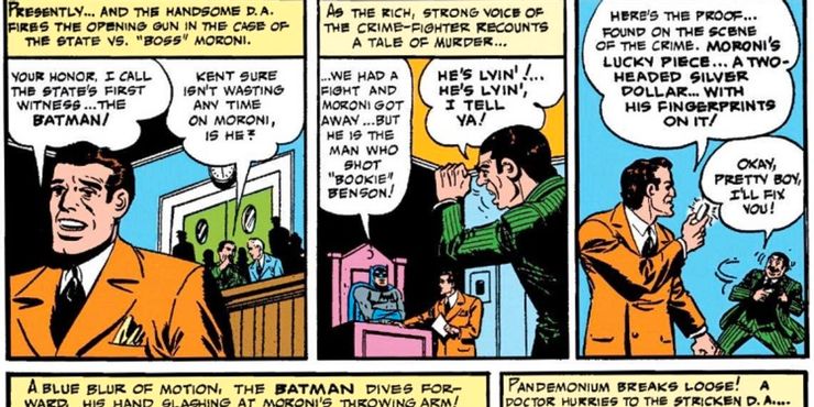 “The Crimes Of Two-Face” es el primer Two-Face de Cómics de detectives #66. Este número de 1942 es esencial para comprender la historia de Harvey Dent, que en realidad se llama aquí Harvey Kent antes de que DC Comics hiciera un cambio para evitar cualquier conexión con Clark Kent.