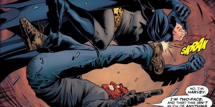los Cállate La historia de principios de la década de 2000 reúne a la mayoría de los principales villanos de Batman, incluido Two-Face. Es una historia importante para Two-Face y una de las mejores, ya que parece dejar atrás su malvado pasado pero es incapaz de escapar de su verdadera naturaleza.