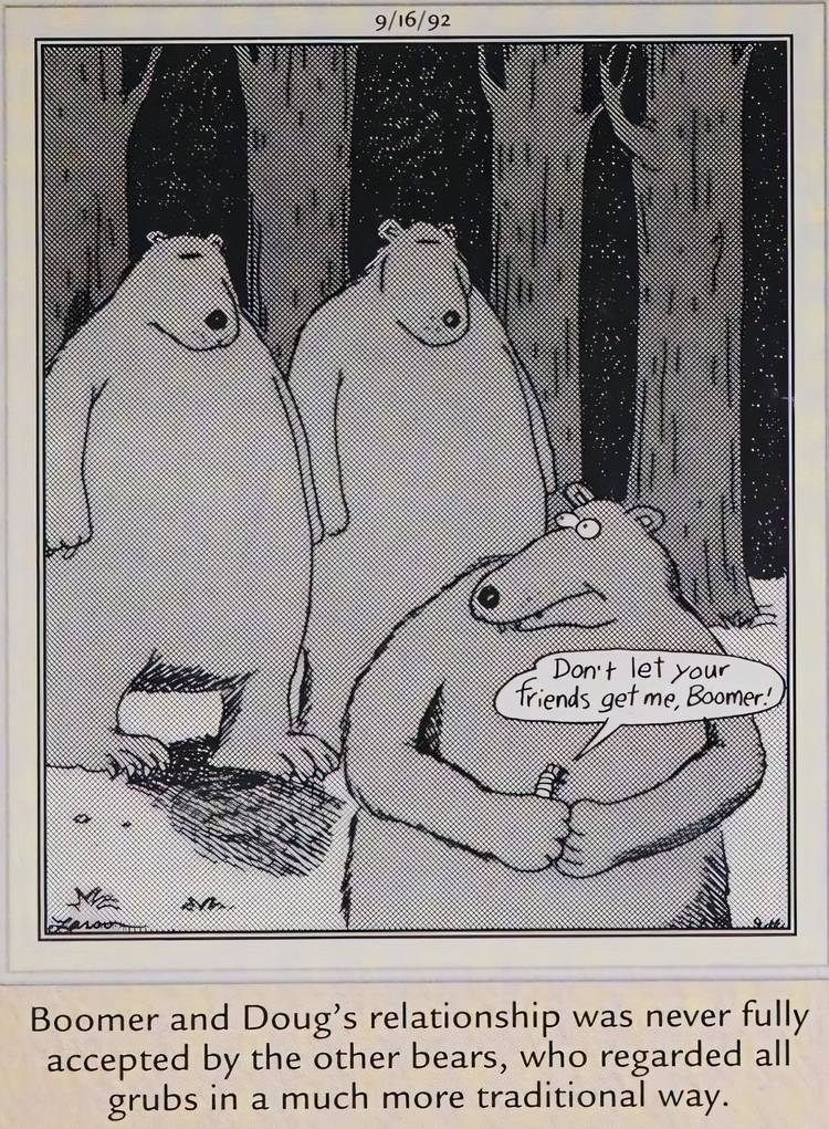 en este hilarante Lado lejano panel de osos, los lectores descubren una ursina crisis de conciencia en progreso, como Un oso, Boomer, que inexplicablemente se ha hecho amigo (o quizás más) de una larva, Doug, debe decidir si protege al insecto de otros osos o sucumbe a la presión de la naturaleza. y entrega a Doug para que se lo coma.