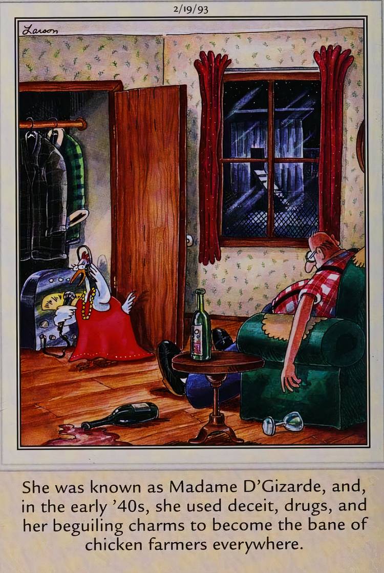 Este Lado lejano El cómic es inolvidable precisamente porque dejará a los lectores preguntándose “¿Qué?“, no son capaces de quitarse la sensación de que se están perdiendo algo más del chiste. El cómic presenta las hazañas de “Señora D’Gizarde,” ¿quién es el título? informa a los lectores “usó engaños, drogas y sus encantos seductores para convertirse en la pesadilla de los criadores de pollos de todo el mundo.”, mientras una gallina con vestido transmite ilícitamente desde la casa de un granjero desmayado.después de drogar su vino.