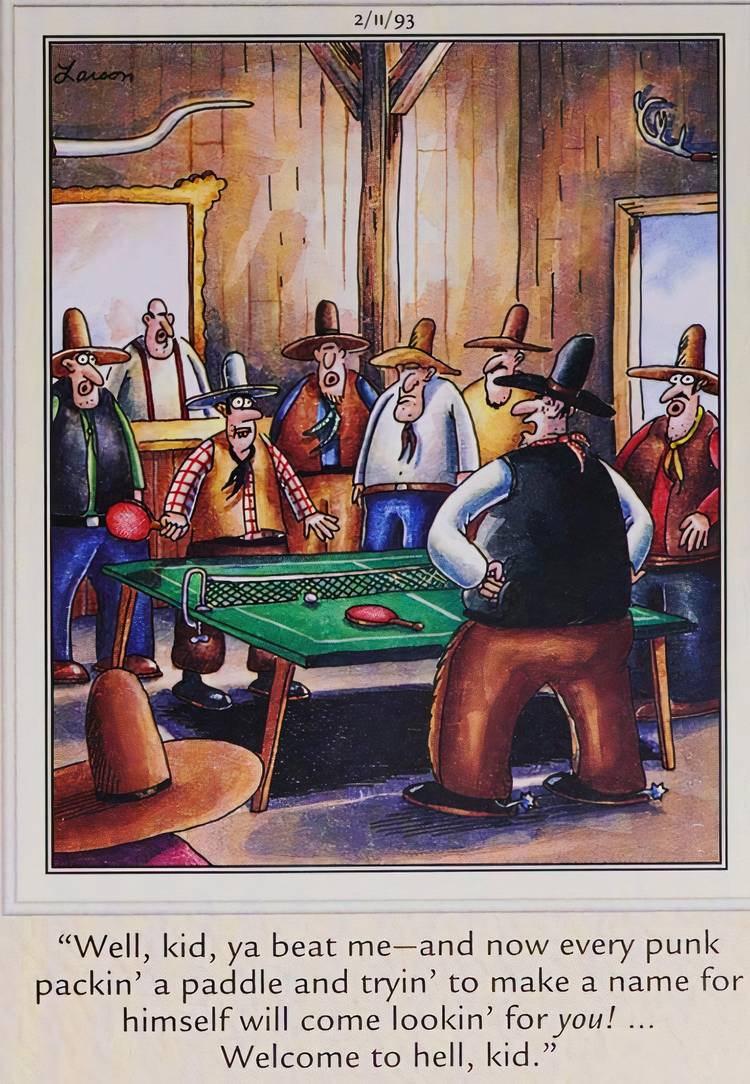 Una de las técnicas cómicas favoritas de Gary Larson consistía en situar su cómic en el momento posterior a que algo hubiera sucedido: aquí, un tenso juego de ping-pong en El lado lejano versión tonta del viejo oestetermina con el hondero residente de la ciudad aceptando magnánimamente la derrota a manos de un joven rival, pero dejando a su oponente con una siniestra advertencia.