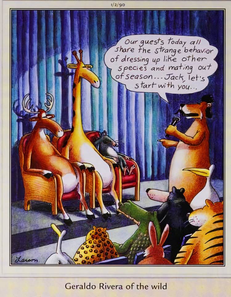Este Lado lejano La caricatura presenta un título simple: “Geraldo Rivera de lo salvaje” – pero su premisa es compleja y deja a los fanáticos del cómic con muchas preguntas. “Todos nuestros invitados de hoy comparten el extraño comportamiento de disfrazarse como otras especies y aparearse fuera de temporada.…” explica el animal Geraldo, mientras Gary Larson satiriza la naturaleza cada vez más lasciva de la noticia.que en ese momento todavía se estaba transformando lentamente en entretenimiento.