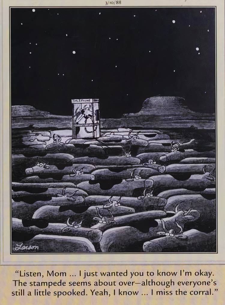 en esto Lado lejano caricatura de vaca, una vaca utiliza una cabina telefónica para llamar a casa y le explica a su madre que “la estampida parece haber terminado,” antes de tocar la fibra sensible al admitir: “extraño el corral“. Con este chiste, Gary Larson describe con humor el fenómeno de quedar atrapado entre una multitud y sólo en retrospectiva darse cuenta de que fue un error.