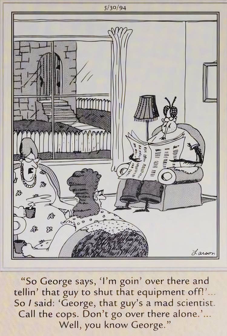 Algunos de los más ambiciosos de Gary Larson Lado lejano Los chistes dejaron a los lectores con más preguntas que respuestas, mientras que otros lograron contar una historia completa por sí mismos, pero aun así insinuaban un contexto mucho más amplio. Este panel es un ejemplo de esto último; su ambición también se desprende de la complejidad de la ilustración, en relación con la mayoría Lado lejano paneles, ya que implicaba un título extendido, un diálogo dentro del marco y una imagen dentro de la imagen, todo ello situado alrededor de una escena de acción.