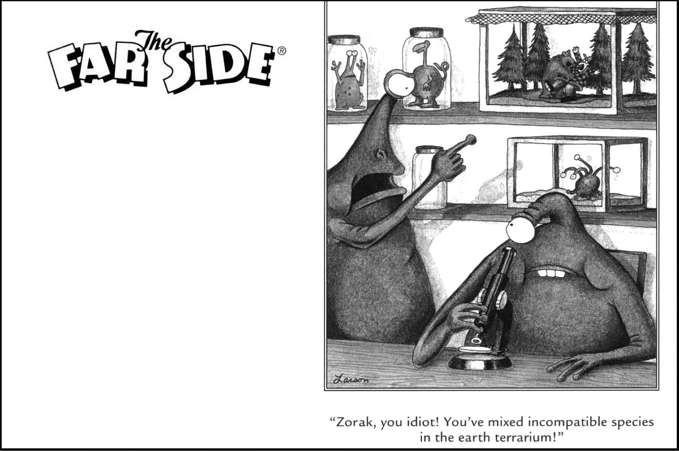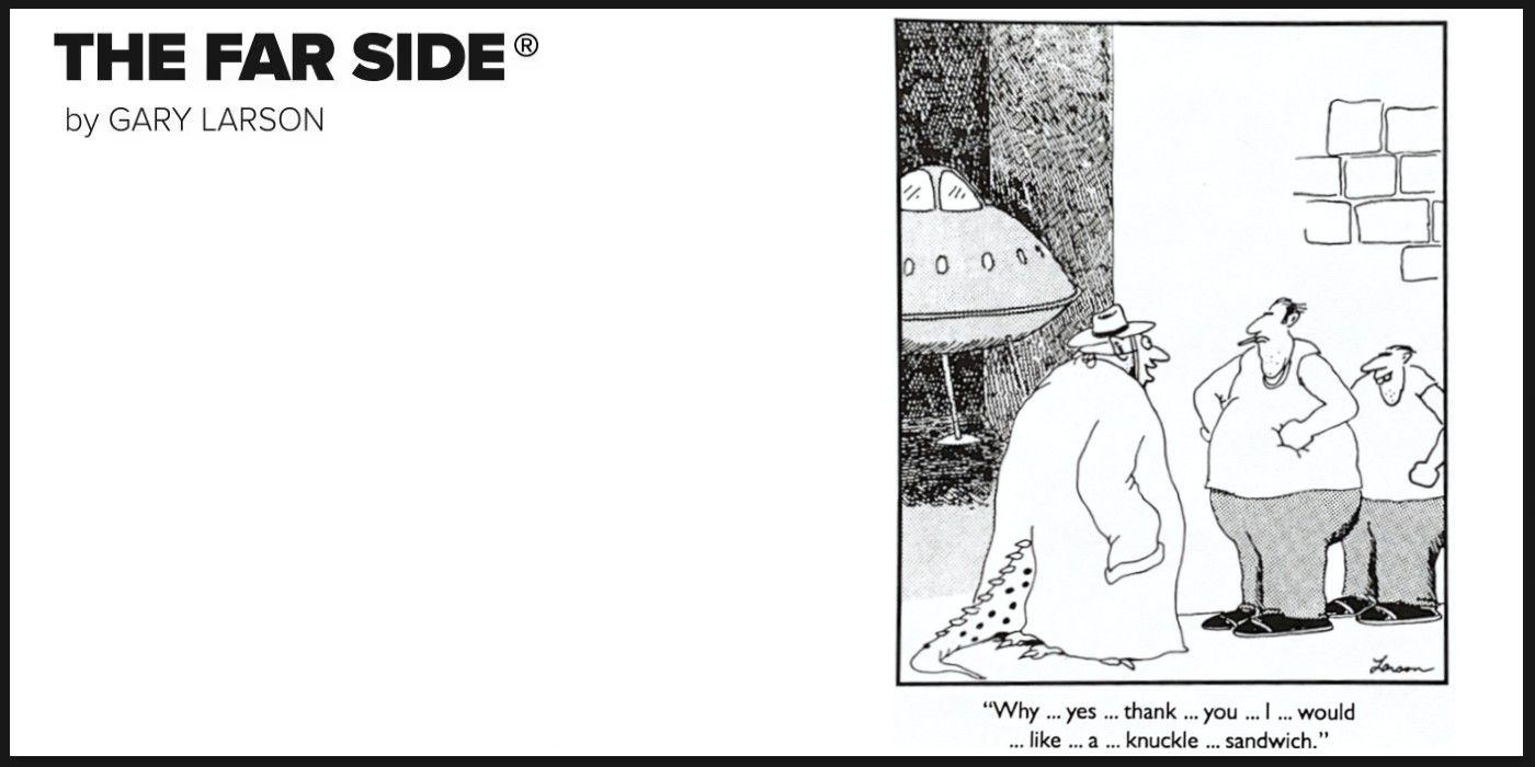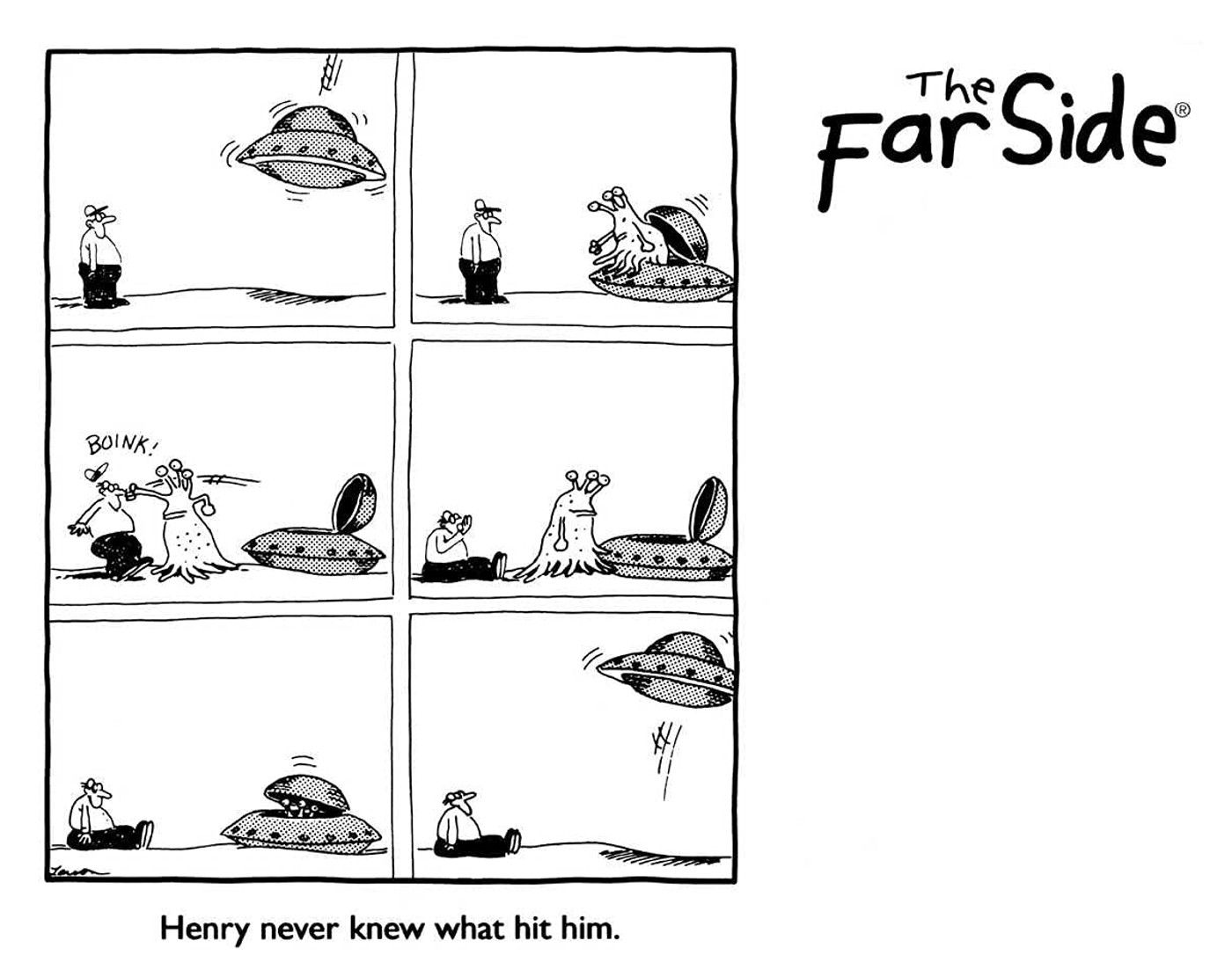 Los rufianes callejeros estereotípicos se sienten como en casa en el lado lejano como vida extraterrestre, y en esta franja los dos se encuentran. Con un extraterrestre ridículamente mal disfrazado, lo que engendra tal humor en la pieza es la ingenuidad extrañamente conmovedora del extraterrestre cuando se compara con la fría bienvenida de la América urbana. La tira es notable porque muestra cómo Larson a menudo usa diferentes planos para incluir contexto adicional en un solo panel: el OVNI en el fondo apenas puede registrarse fuera de confirmar que el hablante es un extraterrestre, pero la capacidad de Larson para deslizar estas pistas contextuales ha sido festejada. por muchos dibujantes profesionales. Sumado a la forma en que el diálogo implica lo que ya se ha dicho, este cómic ejemplifica cómo Larson puede contar una historia en un solo panel.