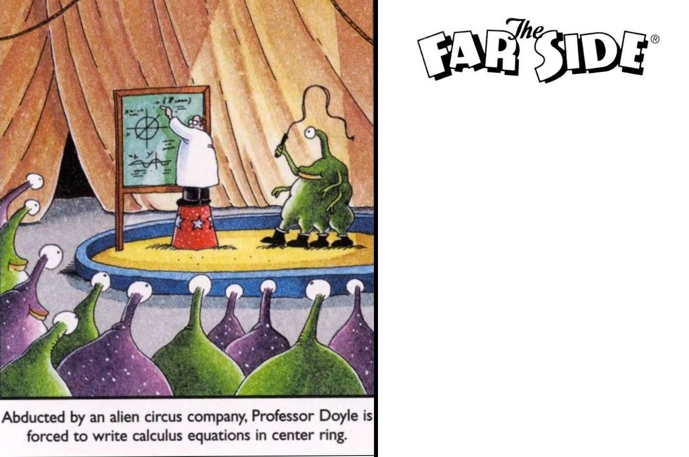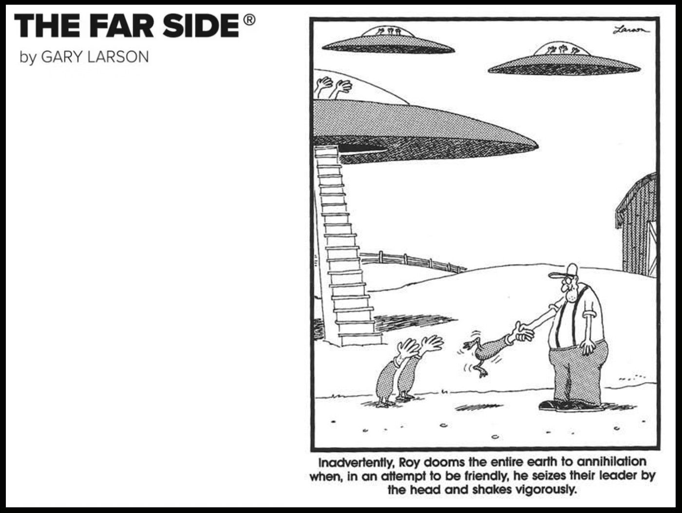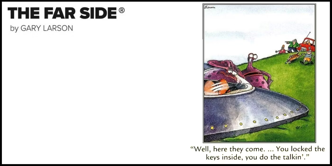 Los rufianes callejeros estereotípicos se sienten como en casa en el lado lejano como vida extraterrestre, y en esta franja los dos se encuentran. Con un extraterrestre ridículamente mal disfrazado, lo que engendra tal humor en la pieza es la ingenuidad extrañamente conmovedora del extraterrestre cuando se compara con la fría bienvenida de la América urbana. La tira es notable porque muestra cómo Larson a menudo usa diferentes planos para incluir contexto adicional en un solo panel: el OVNI en el fondo apenas puede registrarse fuera de confirmar que el hablante es un extraterrestre, pero la capacidad de Larson para deslizar estas pistas contextuales ha sido festejada. por muchos dibujantes profesionales. Sumado a la forma en que el diálogo implica lo que ya se ha dicho, este cómic ejemplifica cómo Larson puede contar una historia en un solo panel.