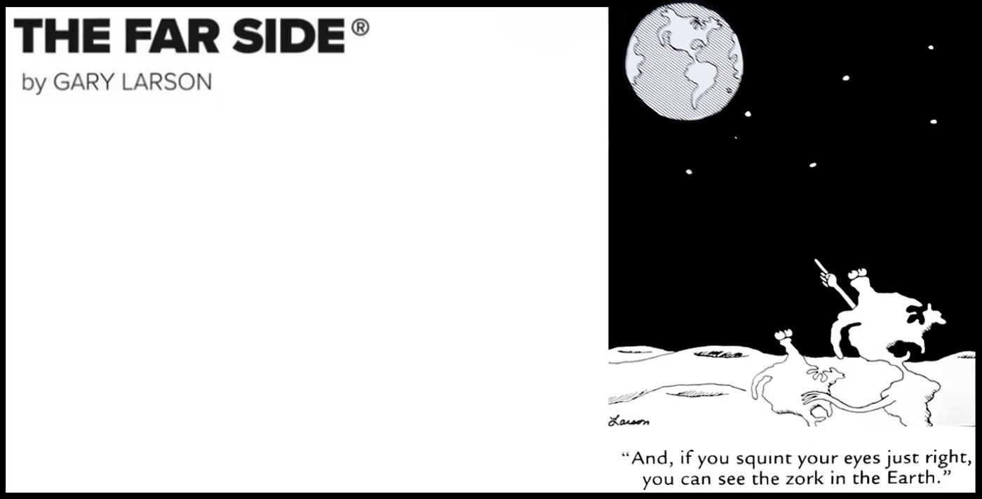 Otro chiste visual tonto, ‘El Zork en la Tierra’ es una obra de teatro sobre ‘El hombre en la luna’. Inicialmente, la broma parece ser que los extraterrestres participan en el mismo tipo de ilusiones voluntarias que los humanos, pero una segunda mirada revela que, si bien podemos estar bromeando cuando vemos un rostro humano en la luna, la forma de Zork es en realidad extrañamente similar a la continentes americanos. Si bien no es exactamente desafiante, esta tira muestra el lado lejanoLa voluntad de basar su broma en pequeños detalles que le piden al lector que trabaje en su remate, algo que a menudo no es el caso entre los contemporáneos de la tira.