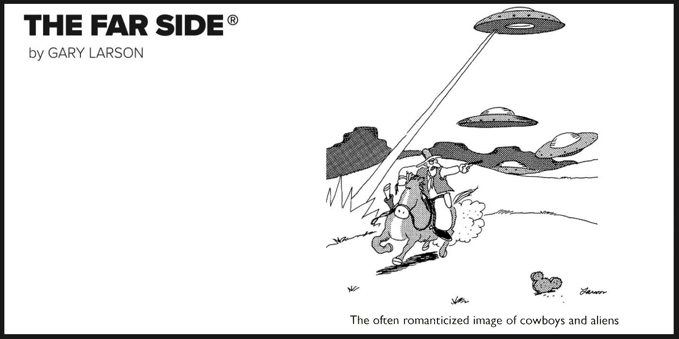 Mientras el lado lejano se especializa en observaciones sobre la naturaleza y la vida animal, ese interés a menudo se extiende más allá de su planeta de origen. Es posible que Gary Larson haya evitado presentar personajes recurrentes, pero junto con los dinosaurios y los hombres de las cavernas, los extraterrestres suelen protagonizar la icónica mirada lateral de la vida del cómic.