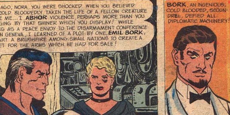 El cómic también presenta a uno de los villanos más poderosos de Peacemaker, Emil Bork. Bork es un traficante internacional de armas que avivó la violencia con fines lucrativos. Sería el modelo para muchos villanos Peacemaker tanto en Charlton Comics como en DC.
