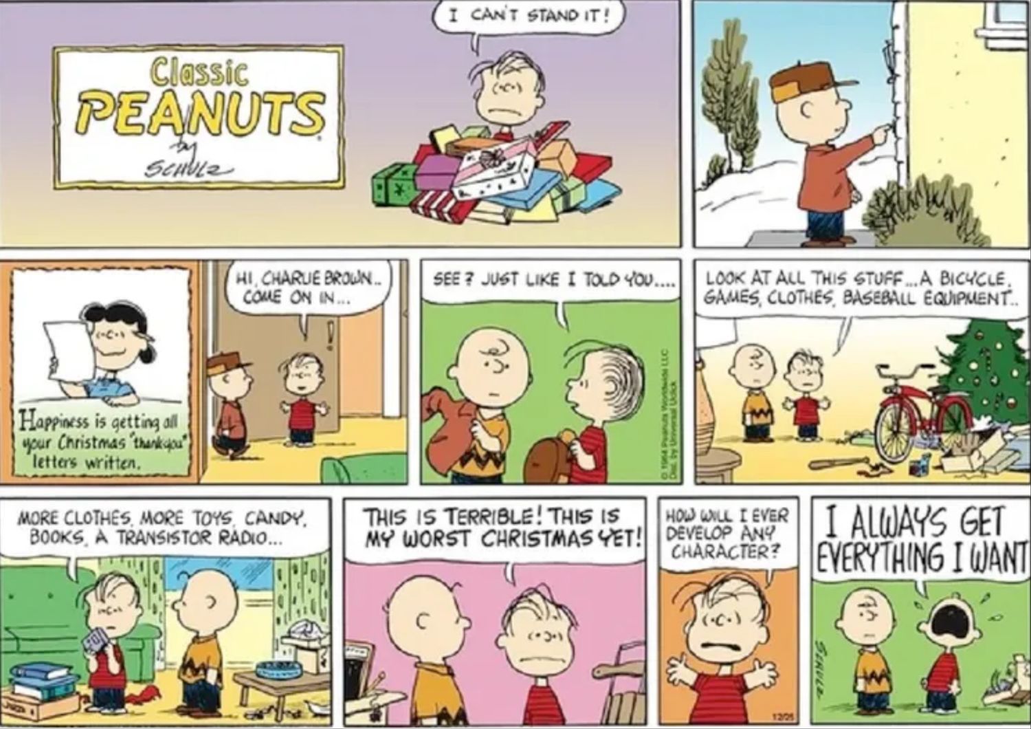 La mayoría de los niños se volverían completamente locos si vieran que obtuvieron todo lo que querían para Navidad. Por otra parte, Linus no es como la mayoría de los niños. En lugar de sentir alegría por su generosa variedad de regalos, está absolutamente desconsolado porque ha recibido todo lo que pidió y, por lo tanto, es incapaz de desarrollar su carácter.