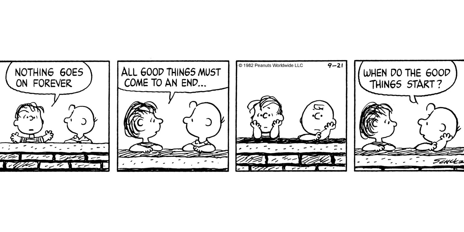 Linus se parece a su hermana Lucy, que da consejos psiquiátricos, en este Miseria cómic. Es un alma muy sabia ya que dice que nada dura para siempre y que todo lo bueno debe llegar a su fin. Lástima para Charlie Brown que las cosas buenas nunca parecen llegar para él.