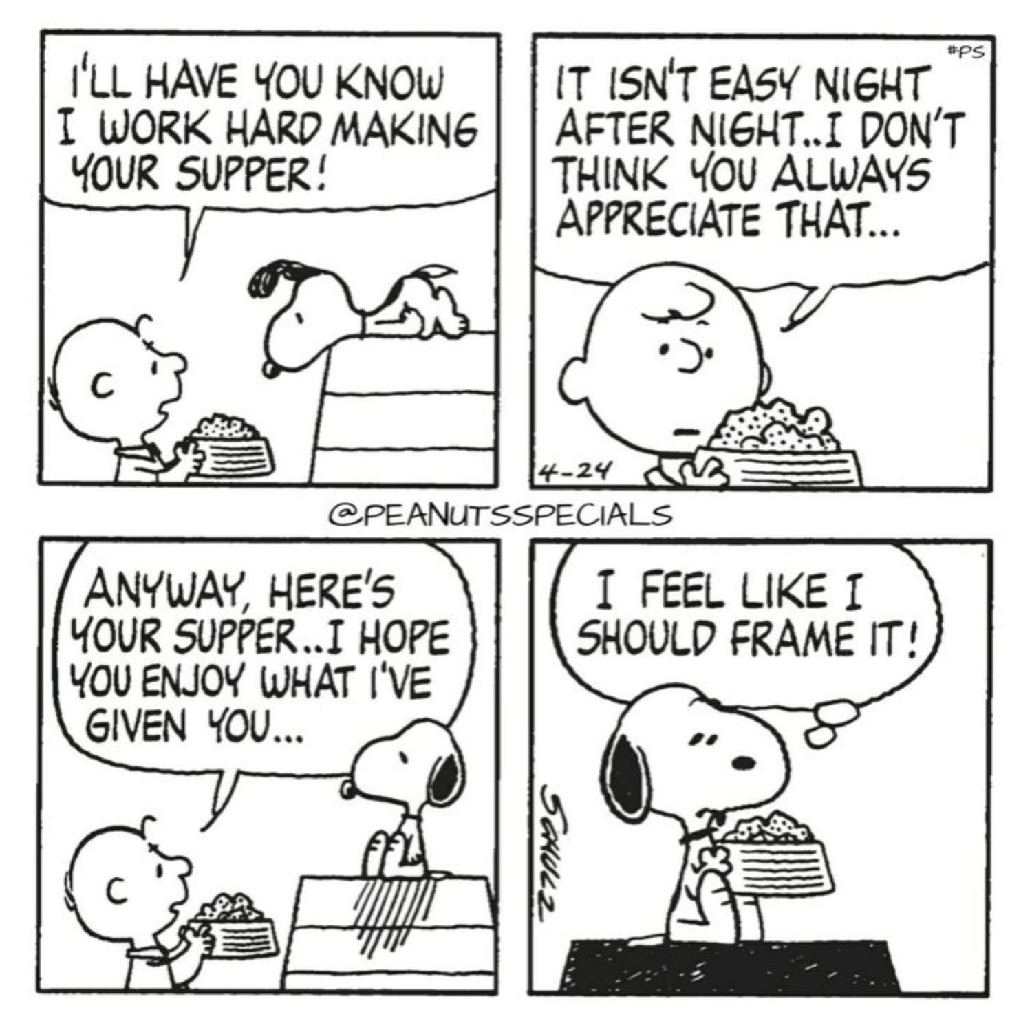 Snoopy puede ser una especie de diva en lo que respecta a su comida. Detesta absolutamente los dulces de coco y se enfadará si se retrasa la cena. Una vez, ni siquiera le importó que su propio dueño estuviera en el hospital hasta que se enteró de que no cenaría. Como resultado, Charlie Brown siente la necesidad de decirle a Snoopy que debería estar agradecido en esta tira.