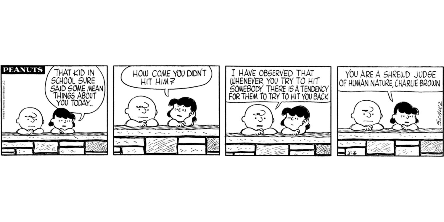 Lucy siempre es la amiga de Charlie Brown a quien recurrir cuando necesita un consejo. Sin embargo, esta vez, es más Lucy la que recibe consejos de Charlie Brown. Cuando Lucy pregunta por qué Charlie Brown no golpeó al niño que lo estaba insultando, él responde que sabía que el niño le devolvería el golpe y esperaba evitar un ojo morado. Lucy asimila esta valiosa información, claramente impresionada por la sabiduría de Charlie Brown.