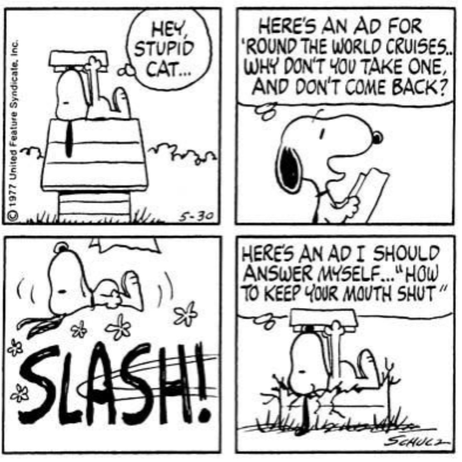 Snoopy es un perro con actitud. No tendría el alter ego Joe Cool sin él. Sin embargo, su descaro le crea problemas más veces de las que le gustaría admitir. En esta tira, Snoopy le grita al gato del vecindario que haga un crucero alrededor del mundo y que nunca regrese, solo para que el gato le devuelva el golpe.