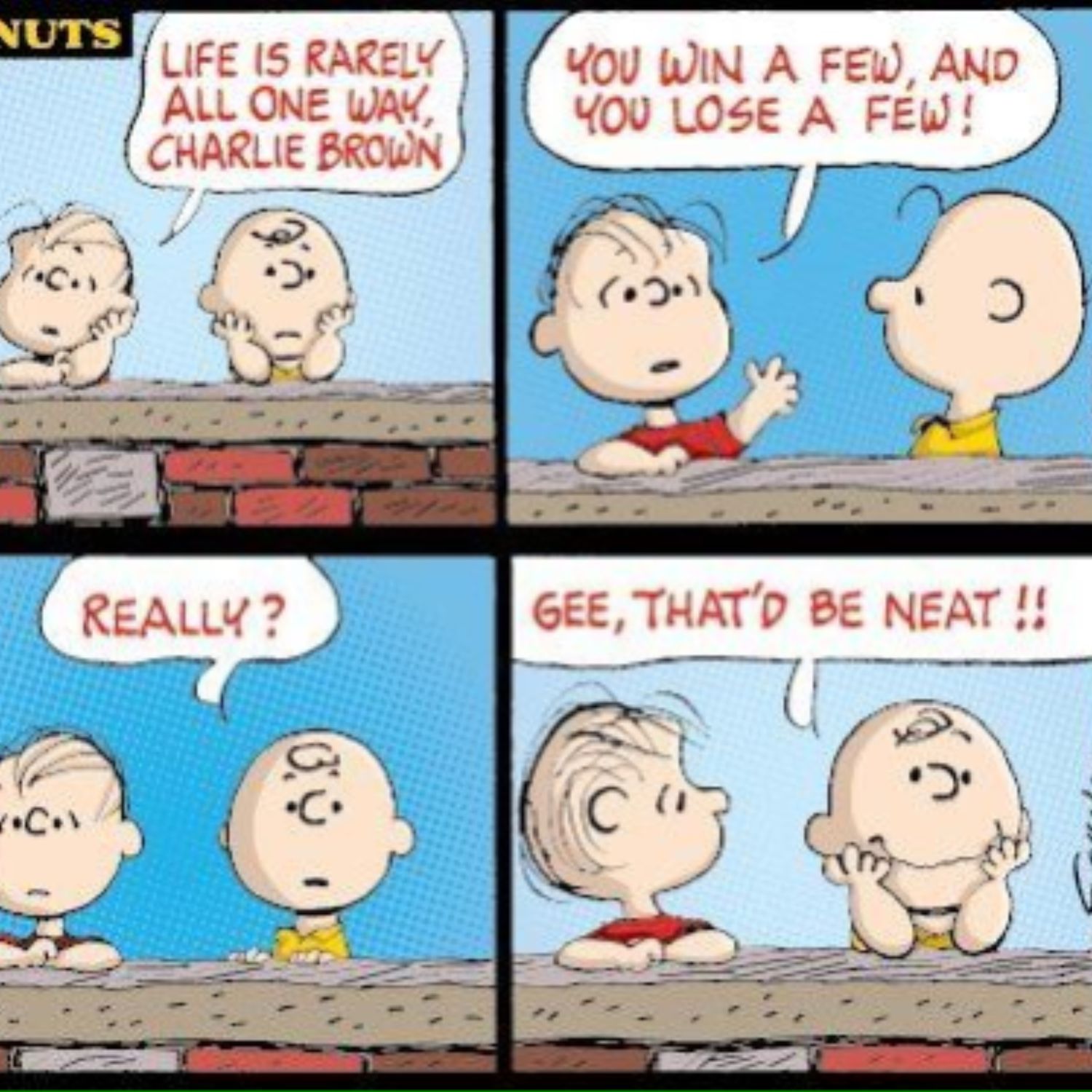 Linus ofrece un consejo importante; que todo el mundo tiene sus altibajos en la vida… excepto Charlie Brown, que ha tenido demasiados bajones. De todos modos, es importante reconocer las victorias y derrotas que todos experimentan porque le permiten a uno apreciar más sus victorias y recordar que cuando experimentan una crisis, la victoria está a la vuelta de la esquina. Bueno, con suerte.