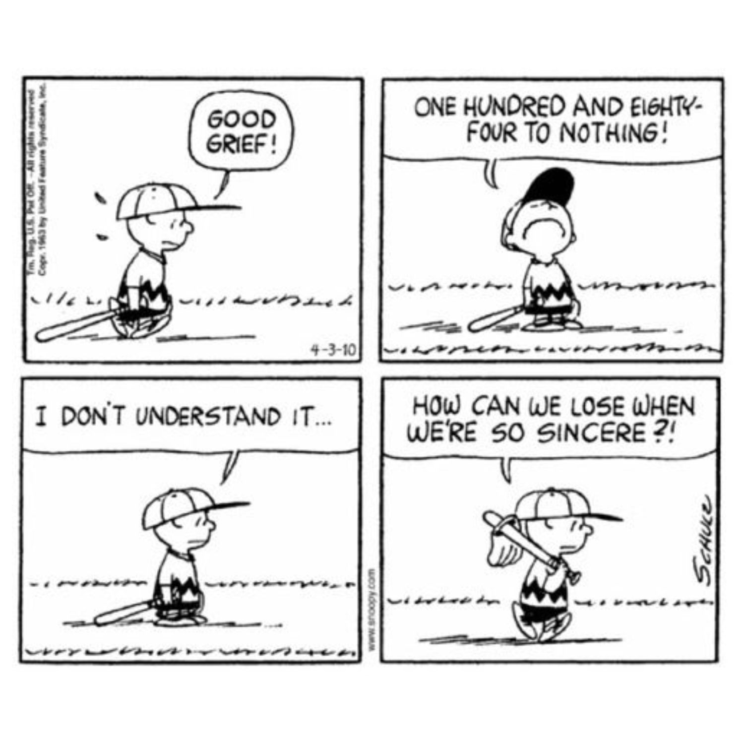 Esta tira ejemplifica la lección significativa de que la vida no siempre es justa. Un equipo puede ser más sincero, pero eso no significa que vaya a ganar, como desgraciadamente Charlie Brown ha tenido que aprender. A veces se necesita más que sinceridad para conseguir lo que se desea, en este caso ganar un partido de béisbol. Por mucho que alguien quiera algo y sea sincero, eso no significa que las cosas siempre saldrán como lo desea.