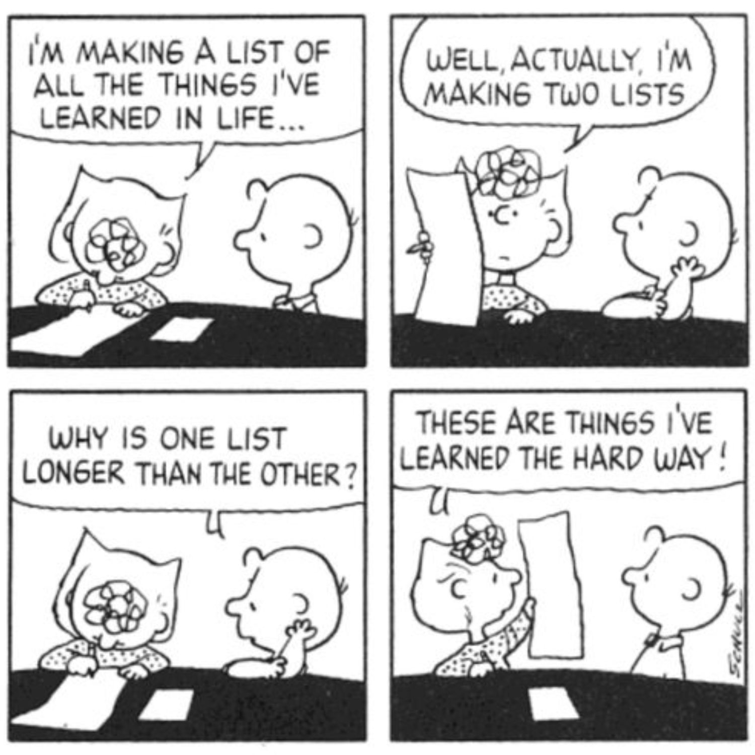 Puede que Sally no siempre diga bien las palabras o no entienda muchas cosas, pero de vez en cuando tiene algunas palabras sabias. En esta tira, Sally le dice a su hermano mayor que está haciendo dos listas sobre las cosas que ha aprendido en la vida, a lo que Charlie Brown le pregunta por qué una lista es mucho más larga que la otra. Sally le informa que la lista más larga está hecha de cosas que ha tenido que aprender por las malas.