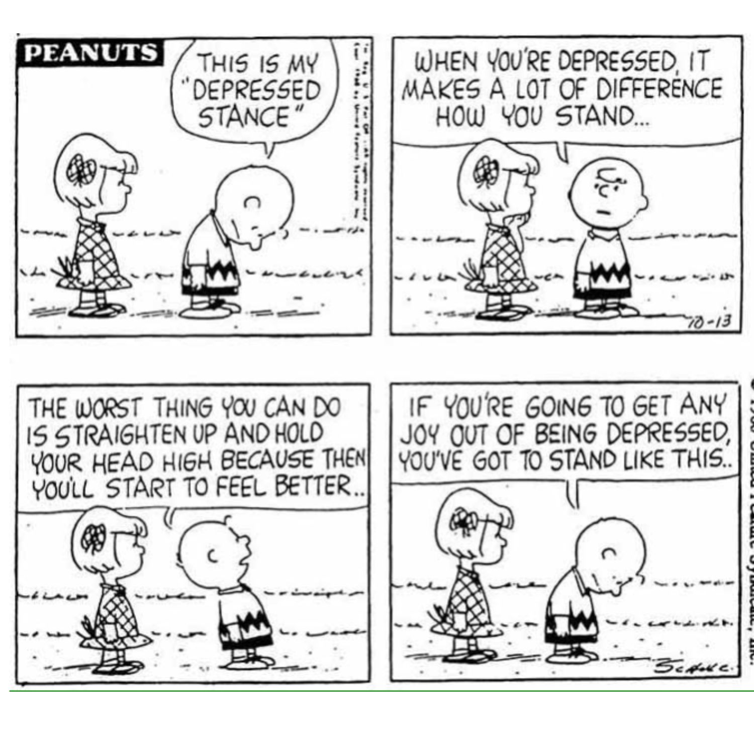 Charlie Brown puede ser un poco deprimente a veces. A menudo es bastante negativo y siempre se lleva la peor parte. Como era de esperar, esto equivale a que Charlie se ponga azul la mayoría de las veces. Como se ve en esta tira, se ve a Charlie Brown deprimido en su postura deprimida y se niega a pararse de manera diferente porque quiere permanecer en su estado mental de mal humor. El típico Charlie Brown.
