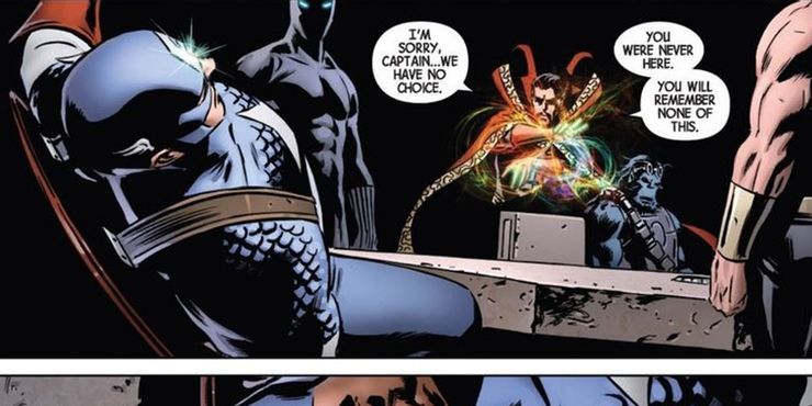 nuevos vengadores vol. 3 #3 es un gran problema para mostrar hasta dónde llegarán los Illuminati para llevar a cabo sus ambiciones. El consejo secreto decide borrar la memoria del Capitán América, con un hechizo lanzado por el Doctor Strange, después de que no está de acuerdo con ellos sobre la política.