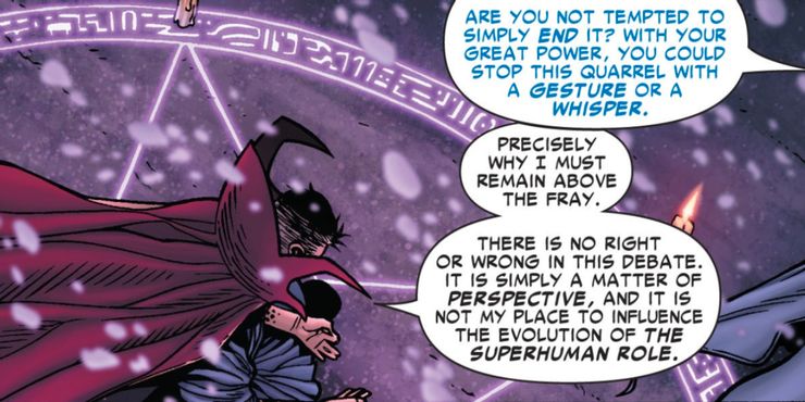 Los Illuminati no juegan un papel directo en los eventos de Guerra civil, uno de los mejores eventos de Marvel Comics, pero la inacción de Doctor Strange hace que este sea uno de los capítulos más intrigantes de su saga. Strange se niega a intervenir en el conflicto después de que Tony Stark obliga a que suceda.