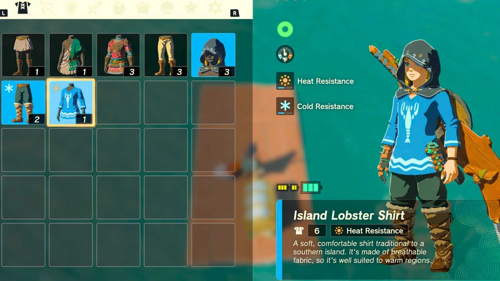 La camisa Island Lobster es una de las piezas de armadura más divertidas del mundo. Zelda: Lágrimas del Reino. Va a Aumenta la resistencia al calor de Link cuando se usa., lo que lo hace ideal para lugares como la región de Gerudo, donde las temperaturas son abrasadoras. Dado que se trata solo de una pieza individual, los jugadores pueden combinarla con elementos de otros conjuntos, como el conjunto Ember que aumenta el poder de ataque en calor, para obtener mejoras adicionales.
