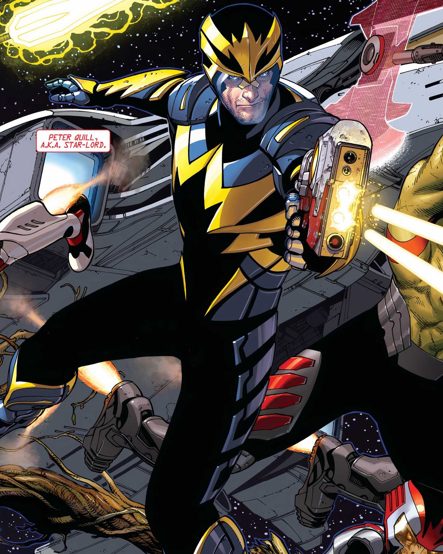Un traje alternativo que Star-Lord debutó durante la misma introducción de la misma serie, este traje hizo su debut adecuado en la portada variante de Ed McGuinness del Número 01. Durante este período de los Guardianes, Iron Man se había unido al equipo. para ayudar a defender la Tierra de la inminente invasión de Thanos. Hasta ahora, Star-Lord nunca ha usado una “armadura” adecuada.