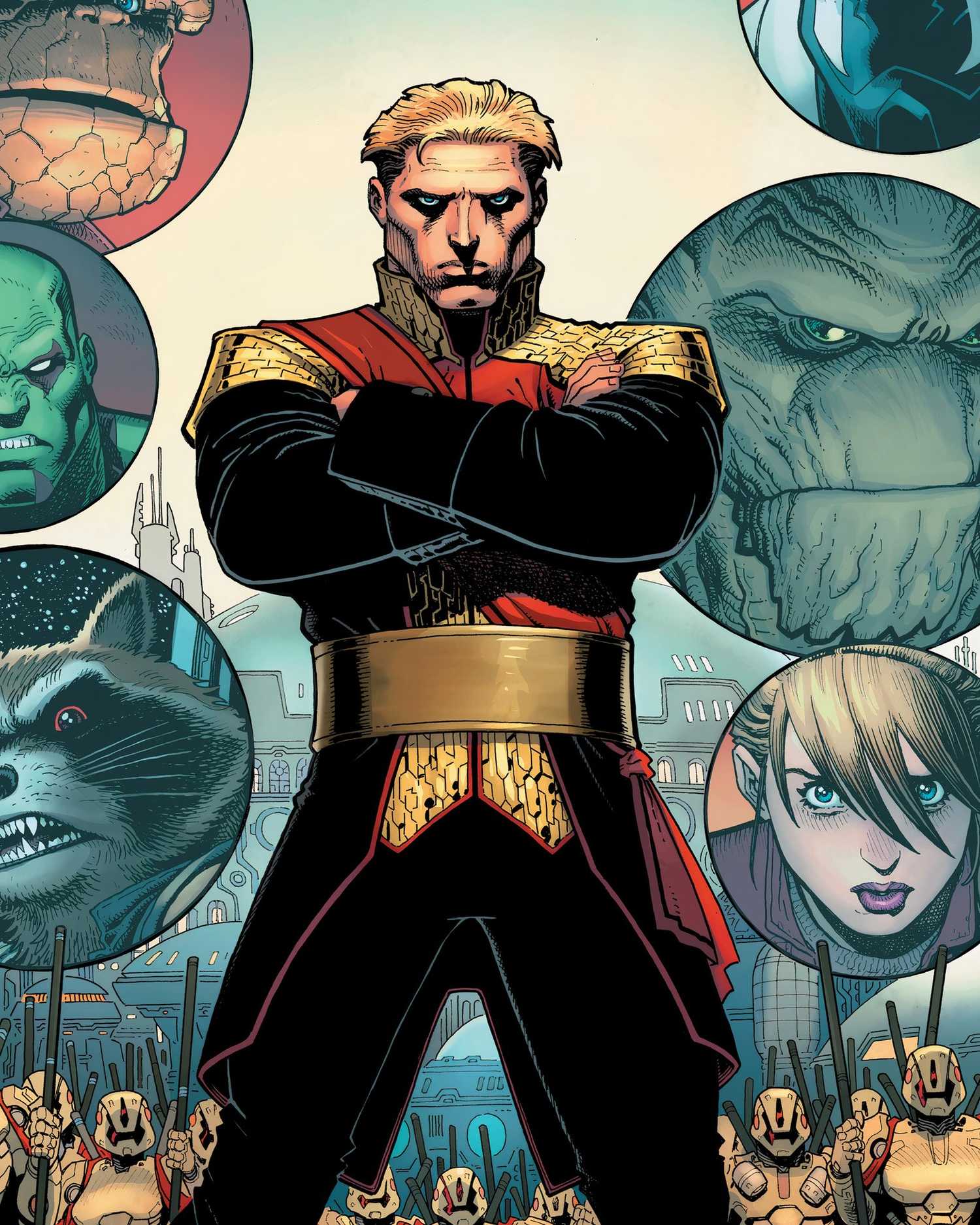 Este nuevo atuendo está fuertemente inspirado en los uniformes militares y policiales británicos más antiguos, aunque depende del esquema de color azul y dorado para representarlo como una “estrella” en el vasto vacío del espacio. La parte más impactante y, sinceramente, la mejor del disfraz es su máscara. Peter quería inclinarse hacia el estatus legendario que su nombre había obtenido en la guerra contra la Aniquilación, deseando ocultar su rostro para que “Star-Lord” podría convertirse en una imagen. Si bien ya no posee sus aumentos cibernéticos, la máscara continúa sirviendo para que Peter se distancie de su sentido de humanidad. Hasta la fecha, esta es probablemente una de sus elecciones de vestimenta más drásticas y, al mismo tiempo, una de las más elegantes que ha tenido.