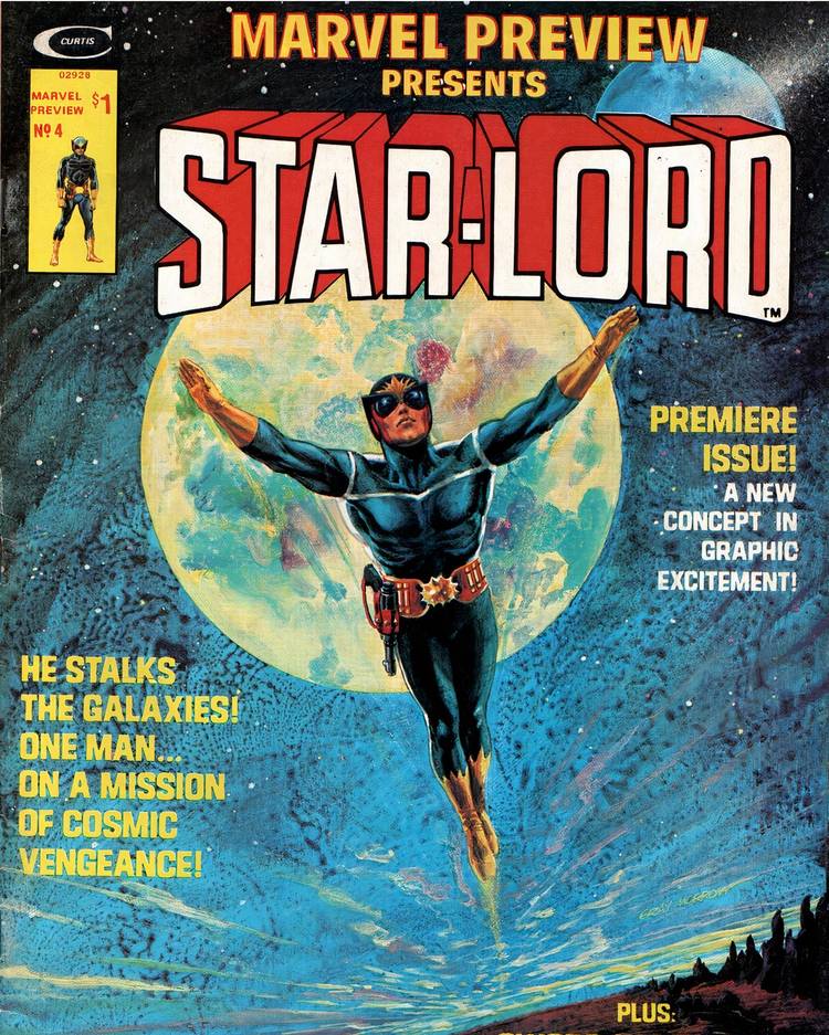 Antes de su introducción moderna en 2004, Star-Lord debutó originalmente en Vista previa de Marvel n.° 4 (1976) de Steve Englehart. Esta versión de Star-Lord es una versión similar a el moderno Peter Quillcon algunas diferencias clave en su historia de origen. Al igual que un personaje como Shazam, los poderes y el disfraz de Peter fueron originalmente otorgado por un mago espacial como herencia de los guardianes galácticos conocidos como Star-Lords.