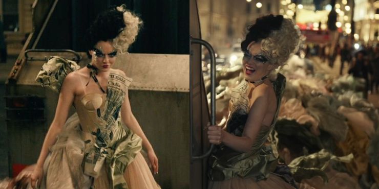 El vestido tiene un toque único, ya que Cruella usó artículos de periódicos de sus eventos pasados como detalles. Lo que realmente distingue al look es cuando ella se aleja y las telas desatendidas resultan ser una cola larga. Los fanáticos tampoco pueden dejar de mirar boquiabiertos su cabello y maquillaje.