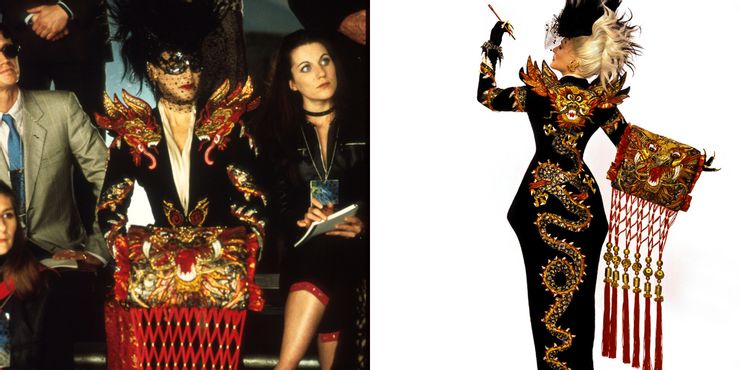 En 102 dálmatas, Cruella va a visitar a un diseñador conocido por trabajar con pieles. Pero de lo que los espectadores no podían dejar de hablar era de su aspecto adornado con dragones. El look se convirtió en uno de los mejores looks de Cruella, ya que tenía detalles impecables e intensos.