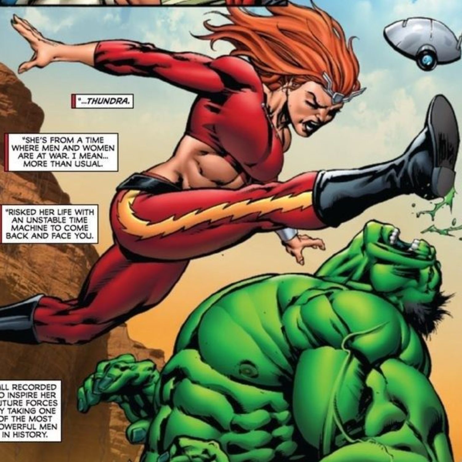 “/> En la línea de tiempo Tierra-715, la guerra química y biológica en el siglo 23 creó un mundo donde sólo el 5 por ciento de la población femenina quedó fértil. Como resultado, las mujeres usurparon el poder de los hombres, quienes causaron la guerra en primer lugar, y establecieron el objetivo de matar a los hombres. Thundra fue criada con el propósito de la dominación femenina en mente. Cuando su mandato como líder la hizo cuestionar su moralidad y cuánto tiempo podría continuar como líder del United Sisterhood Empire, decidió procrear con el hombre vivo más fuerte, Hulk. Ella tuvo experiencia de primera mano de lo fuerte que podía ser, ya que ella misma había luchado contra él anteriormente. Fue inseminada con el ADN de Hulk y tuvo una hija llamada Lyra.