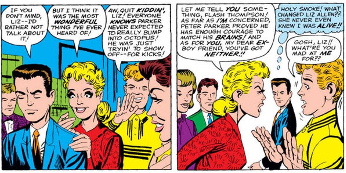 “/> Aunque Betty Brant fue la primera novia de Peter, Liz Allan fue su primer enamoramiento, desde el principio, lo que la convirtió en su primer interés romántico en los cómics. Peter añoraba a la chica popular mientras ella salía con el chico popular, Flash Thompson, formando la pareja poderosa de la escuela. Peter era simplemente un tipo nerd que pasaba desapercibido para todos, por lo que pensó que nunca tendría una oportunidad hasta que ella comenzó a interesarse por él. Para complicar aún más las cosas, estaba aún más enamorada de Spider-Man, a quien ignoraría tanto a Peter como a Flash en favor de él. Cuando se graduaron, Liz finalmente le admitiría a Peter que sentía algo por él, pero también reconoció que nunca podrían estar juntos porque la vida los estaba llevando en direcciones diferentes.