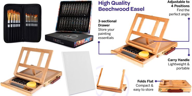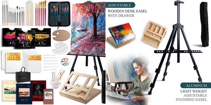 Este kit incluye dos caballetes diferentes: uno de aluminio para estar de pie y otro de madera más pequeño para operar en un escritorio. Para acompañar estos caballetes hay ocho lienzos, cuadernos de bocetos para los tres tipos de pintura y cuatro juegos de pinceles.