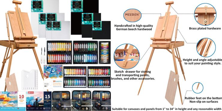 Otro kit de MEEDEN, este empaqueta mucho en uno. Este tiene 5 juegos de pintura que suman un total de 108 tubos de pintura en todo el kit. Incluye un caballete de madera de pie, 30 pinceles, 2 paletas, un bloc de paleta, 10 blocs de lienzo, 15 blocs de acuarela, 2 cuchillos para pintar, 4 lienzos blancos y 4 lienzos negros.