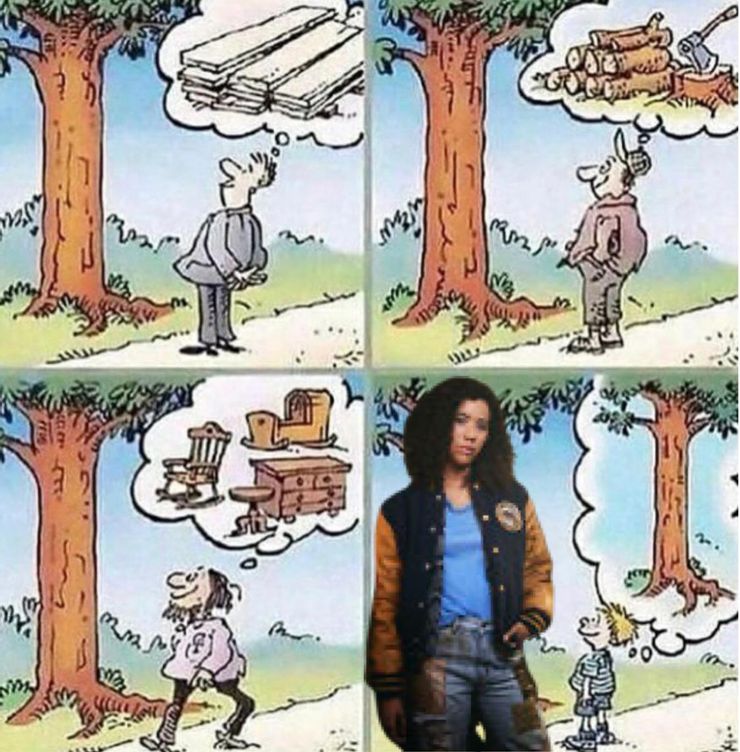 Algunas personas miran un árbol y ven materiales de construcción, algunas personas ven leña y otras ven los materiales para construir muebles, pero Taissa ve una posición desde la cual ceder a su primitivismo.